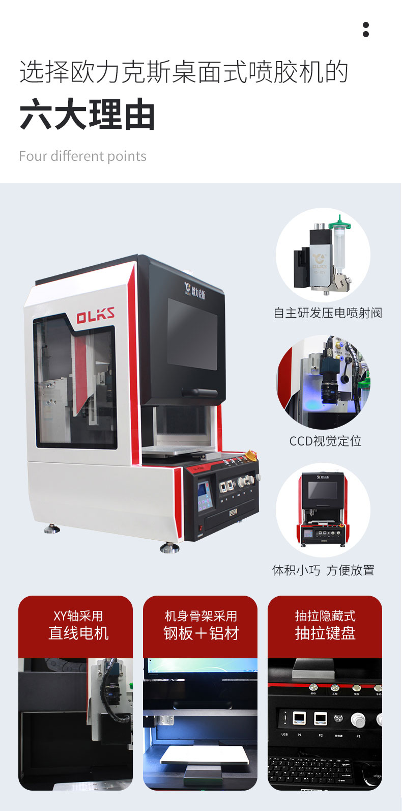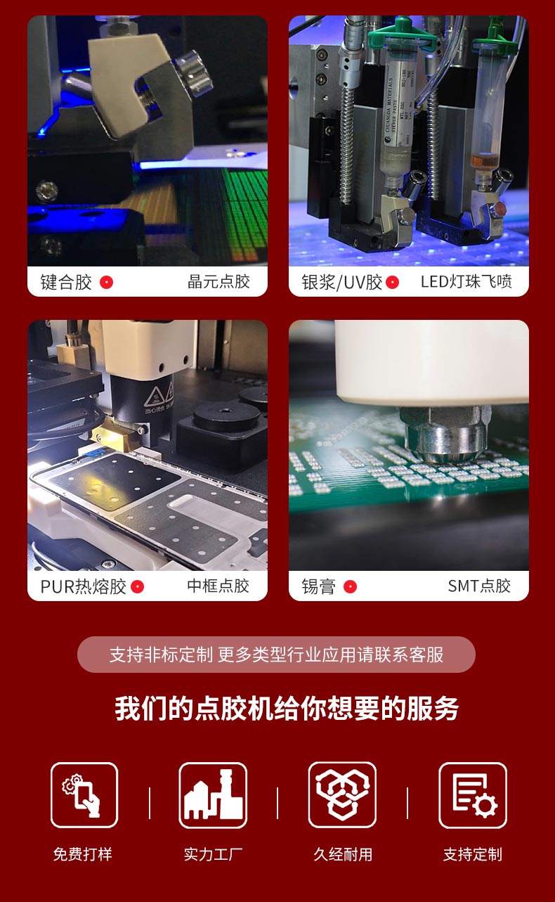 OLKS自動化設備主要應用于高端制造業中的IC芯片封裝、點膠密封、粘接、表面涂覆、定點灌封、高精密非接觸噴射底部填充點膠等組裝作業,行業遍及手機組裝、3C數碼、SMT/EMS、家電、LED照明、新能源、汽車電子、軍工、半導體、醫療器械等。公司始終牢記“利他思維”秉持“匠心精神”,強大技術專家團隊和精英化銷售團隊為客戶提供“星級服務”創造更大價值,助力中國制造2025!